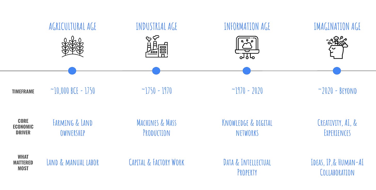 This shift fundamentally rewrites the rules of value creation. Just as the Industrial Revolution transformed physical labor and the Information Age revolutionized knowledge work, the Imagination Age represents an economic revolution that makes human creativity the core driver of value and progress.